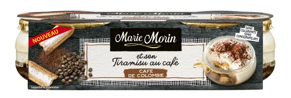 Mascarpone, lòng trắng trứng, đường, bánh quy trứng 12,5% ​​(đường, trứng 35%, bột mì, xi-rô đường nghịch đảo, lòng đỏ trứng, muối, hương liệu), kem đặc Paysan Breton, cà phê 0,5% (nước, đường, cà phê Colombia chiết xuất 2,9%), xi-rô vani (nước, đường, chiết xuất vani), bột ca cao 0,01%.