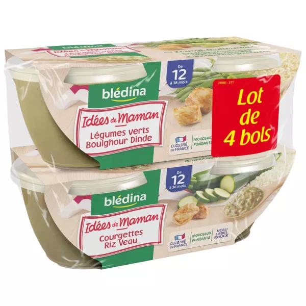 Blédina Mama's Ideas Зеленые овощи Булгур Турция: Вода для варки - вкусная зеленая фасоль 16,0% - приготовленный булгур 12,0% (ГЛЮТЕН) - горох 11,8% - лук-порей 8,67% - мясо индейки 8,00% - картофель - лук - кукурузный крахмал - капелька растительного масла ( рапса, подсолнечника) - соль - щепотка зеленого лука - веточка петрушки - щепотка мускатного ореха. Идеи Blédina Mum Цукини с рисом и телятиной: вкусные кабачки 30,8 % - вода для варки - вареный рис 13,3 % - картофель - Label Rouge телятина (LA 08-93) 8,00 % - морковь - кукурузный крахмал - лук - шпинат - сливки (МОЛОКО) - a капля растительного масла (рапсовое, подсолнечное) - щепотка чеснока - соль - щепотка зеленого лука - веточка петрушки - щепотка душицы.