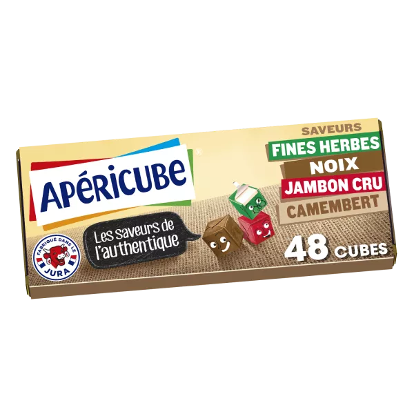 МОЛОКО обезжиренное регидратированное (происхождение: Франция), СЫР (включая 10% камамбера в кубиках камамбера), МАСЛО, МОЛОЧНЫЕ белки, соли-плавители (полифосфаты, цитраты натрия и лимонная кислота), необходимые для связывания ингредиентов и получения кремовой текстуры, 0,55% петрушка и зеленый лук в кубиках Fine Herbs, натуральный ароматизатор в кубиках грецкого ореха, натуральные ароматизаторы и соль в кубиках сырой ветчины и камамбера.