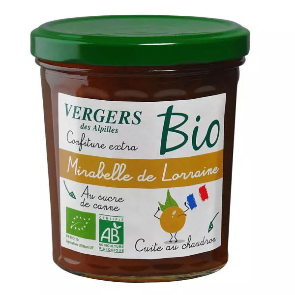 Органическая слива мирабель из Лотарингии, органический тростниковый сахар, желирующий агент: фруктовый пектин, подкислитель: концентрированный органический лимонный сок.