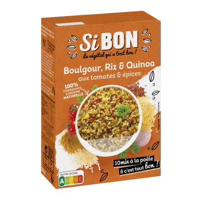 Булгур (предварительно приготовленная дробленая ПШЕНИЦА твердых сортов) 46%, пропаренный длиннозерный рис 18%, предварительно приготовленная красная лебеда 12%, желтая чечевица, обжаренные травы (лук, лук-шалот 1,2%, оливковое масло холодного отжима), помидоры 3%, КУНЖУТ , соль, ароматические растения, специи 1%, может содержать молоко, сою, сельдерей и горчицу,