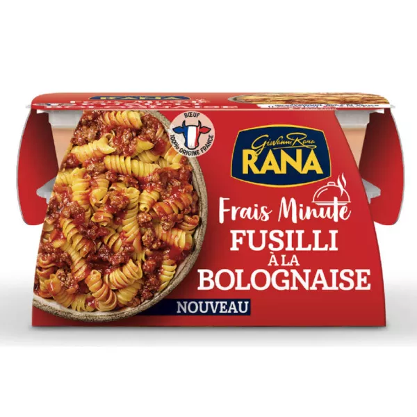 Sauce fraîche à la bolognaise à la tomate et à la viande de bœuf : tomate 29%, viande de bœuf 23%, eau, huile d'olive extra vierge, fromage Parmigiano Reggiano AOP*, carottes , beurre, oignons, vin rouge, arômes naturels, céleri, concentré de tomate 1%, sel, extrait d'épices. Pâtes fraîches aux oeufs: semoule de blé dur, œufs 20%, eau.