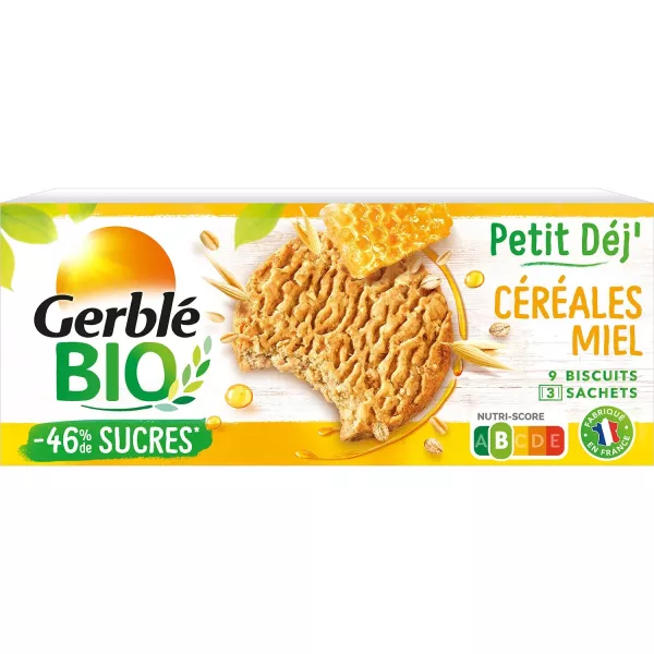 Flocons d'avoine* 33%, farine complète de grand épeautre (blé)* 18,1%, farine complète de blé* de meule 16,2% huile de tournesol oléique*, sucre de canne*, riz* 5,3%, miel* 5,3%, avoine* 0,5%, poudres à lever (acide citrique, carbonates de sodium), sirop de malt d'orge*. *Ingrédients issus de l’agriculture biologique
